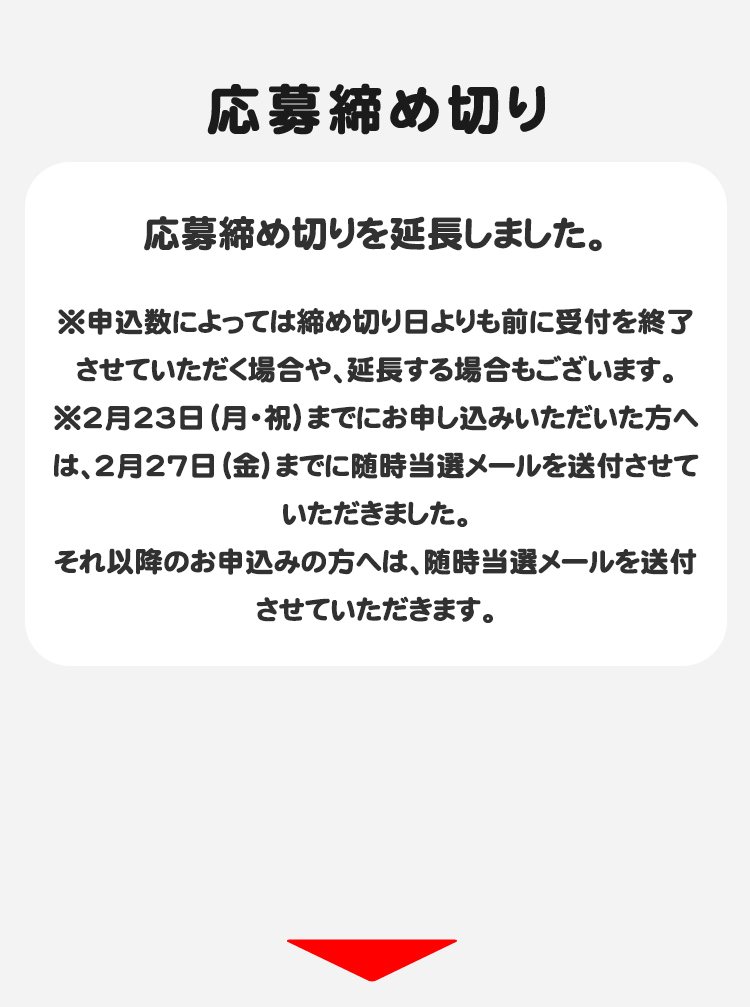 応募に関する個人情報は、当選メールの送付やお知らせ等の発送に使用させていただきます。